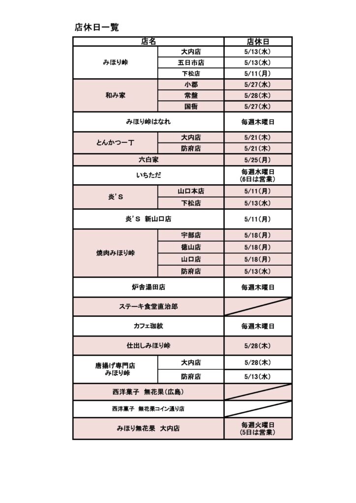 5月の各店舗の店休日につきまして、